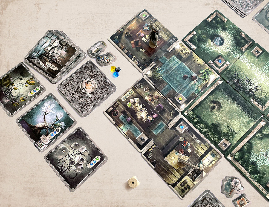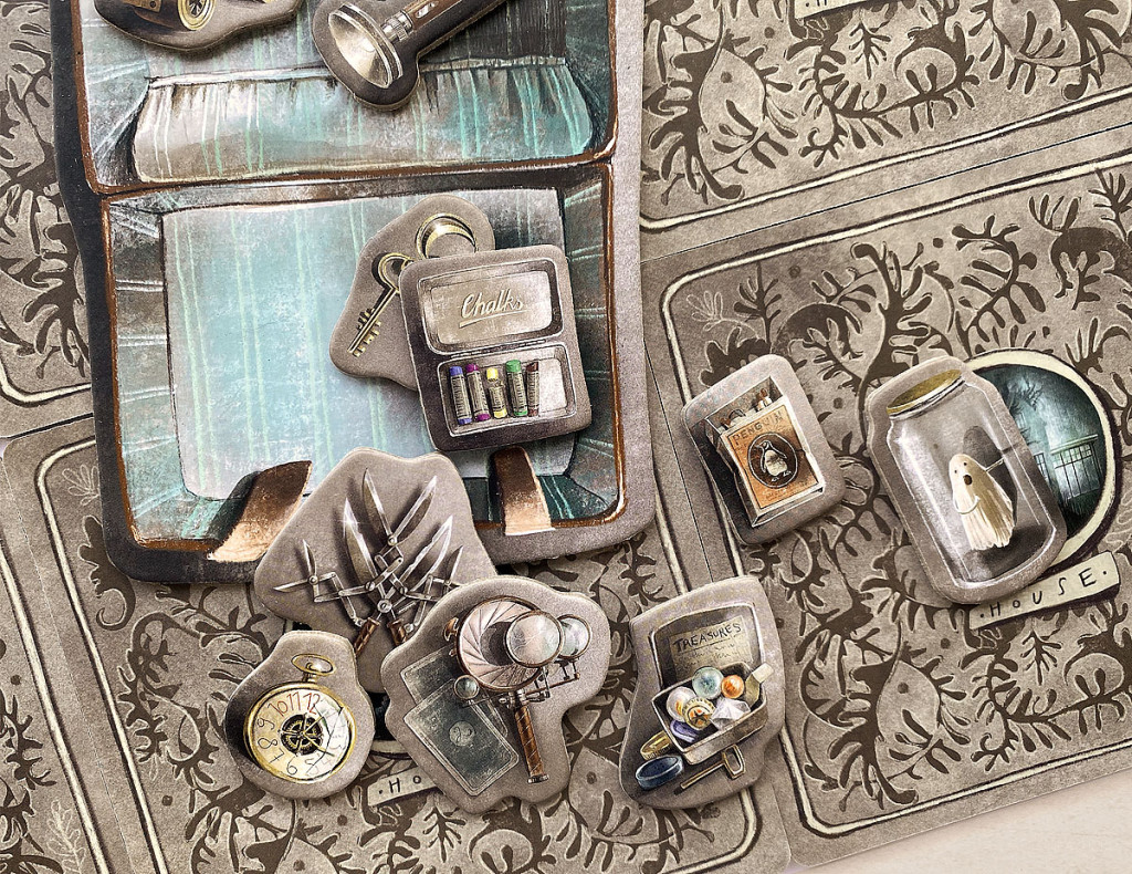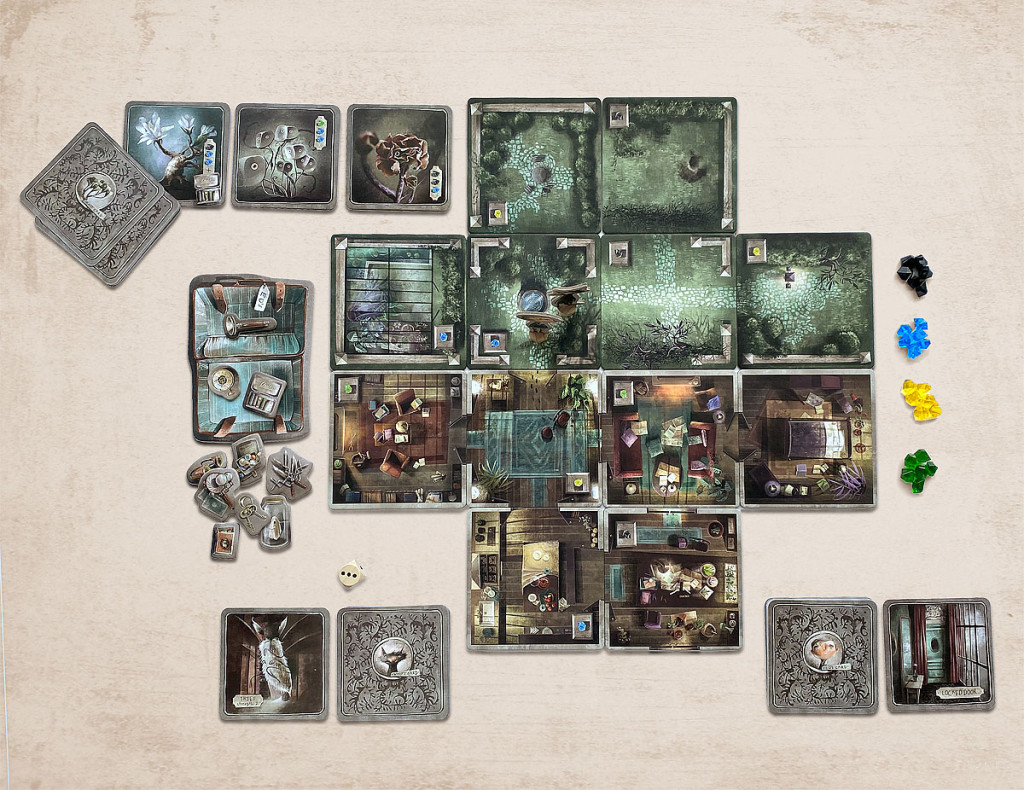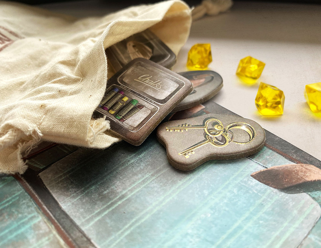 12 tereplapka, 1 kocka10 ketyere, 2 figura2 x 21 idő kártya15 növény kártya4x6 kristály, 1 bőrönd